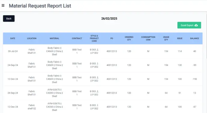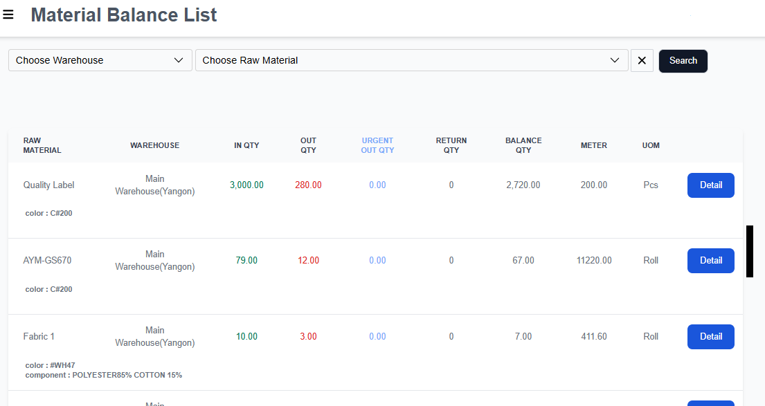 - ပိတ်လိပ်များနှင့် Accessory များကို ထုတ်ပေးရသည့်အခါ Contract နှင့် Style အလိုက် ထုတ်ပေးရသောပစ္စည်း Qty, Length တို့ကိုမှတ်ထားနိုင်ပြီး ပစ္စည်းများ၏ အဝင်နှင့်အထွက်စာရင်းများကိုတွက်ချက်ပေးပြီး Inventory လက်ကျန်စာရင်းများကို မှန်ကန်စွာ အချိန်နှင့်တပြေးညီအသေးစိတ်ဖော်ပြပေးနိုင်ခြင်း