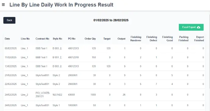 - အထည်များကို လိုင်းထိပ် Table QC တွင်စစ်ပြီး၍ Good, Defect (ပဲထည်များ), Reject စာရင်းများ၊ လိုင်းထွက်အထည်စာရင်းများကိုမှတ်သားနိုင်ပြီးDefect ပွိုင့် (ပဲပွိုင့်)၊ Defect (ပဲထည်များ) ကျသည့်အကြိမ်အရေအတွက်နှင့် Table QC မှ Hourly စစ်ရသောအကြိမ်အရေအတွက်များကိုသိရှိနိုင်မှာဖြစ်ခြင်း