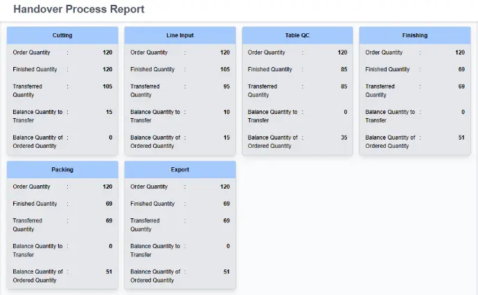 - Style တစ်ခုချင်းအလိုက် WIP (Work In Progress) တစ်ဆင့်ချင်းစီတွင်ပြီးစီးမှု၊ လက်ကျန် စာရင်းတို့ကို Report တွင်ကြည့်နိုင်ခြင်း
